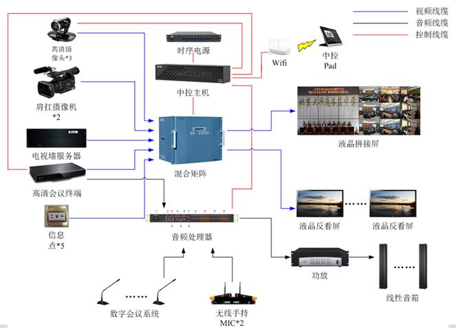 在麥克風音頻輸入處理:會場發(fā)言人員采用無線數(shù)字會議系統(tǒng)。麥克風拾音后,即可以在本地會場擴音播出,也可以通過視頻會議系統(tǒng)傳送到遠端會場播出。
