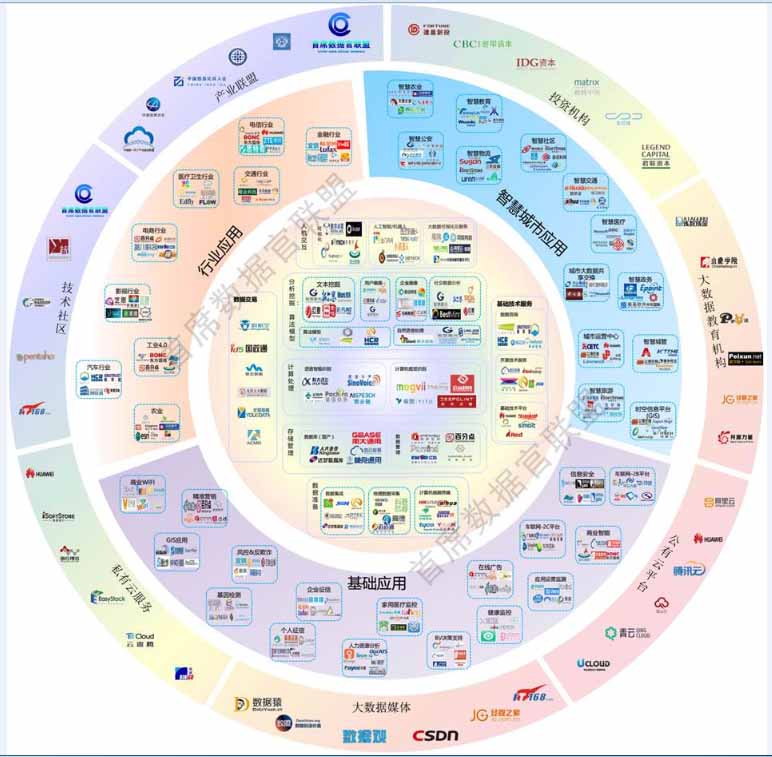 中國大數(shù)據(jù)產(chǎn)業(yè)地圖結(jié)構(gòu)為外圓內(nèi)方。分為三層:核心技術(shù)、應(yīng)用、周邊服務(wù)。